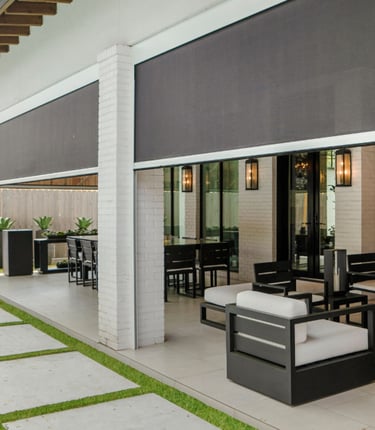 Custom motorized patio shades designed for unparalleled comfort and style on the beautiful Lake Michigan shore and surrounding areas, providing protection from the sun while allowing you to enjoy the stunning views and fresh air all year round.